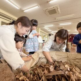 幼稚園のホールにどんぐりプールが出現しました! 落ち葉をかき分けいろんな形のどんぐりを拾い、マラカスを作りました。 今日は秋のコンサート♪ マリンバや…